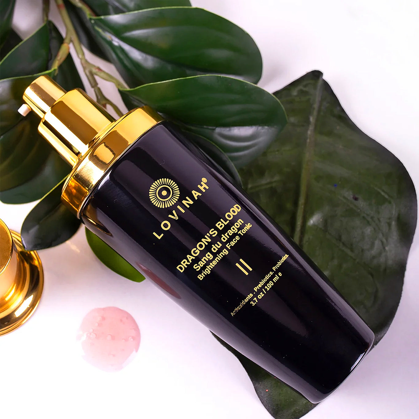 Le Tonique Sang du Dragon qui est notamment composé de Résine de Sang du Dragon riche en Antioxydants, et de Thé Rooibos, revitalise la peau, la protège des dommages environnementaux et uniformise le teint. La peau est ainsi nette, purifiée et lumineuse.