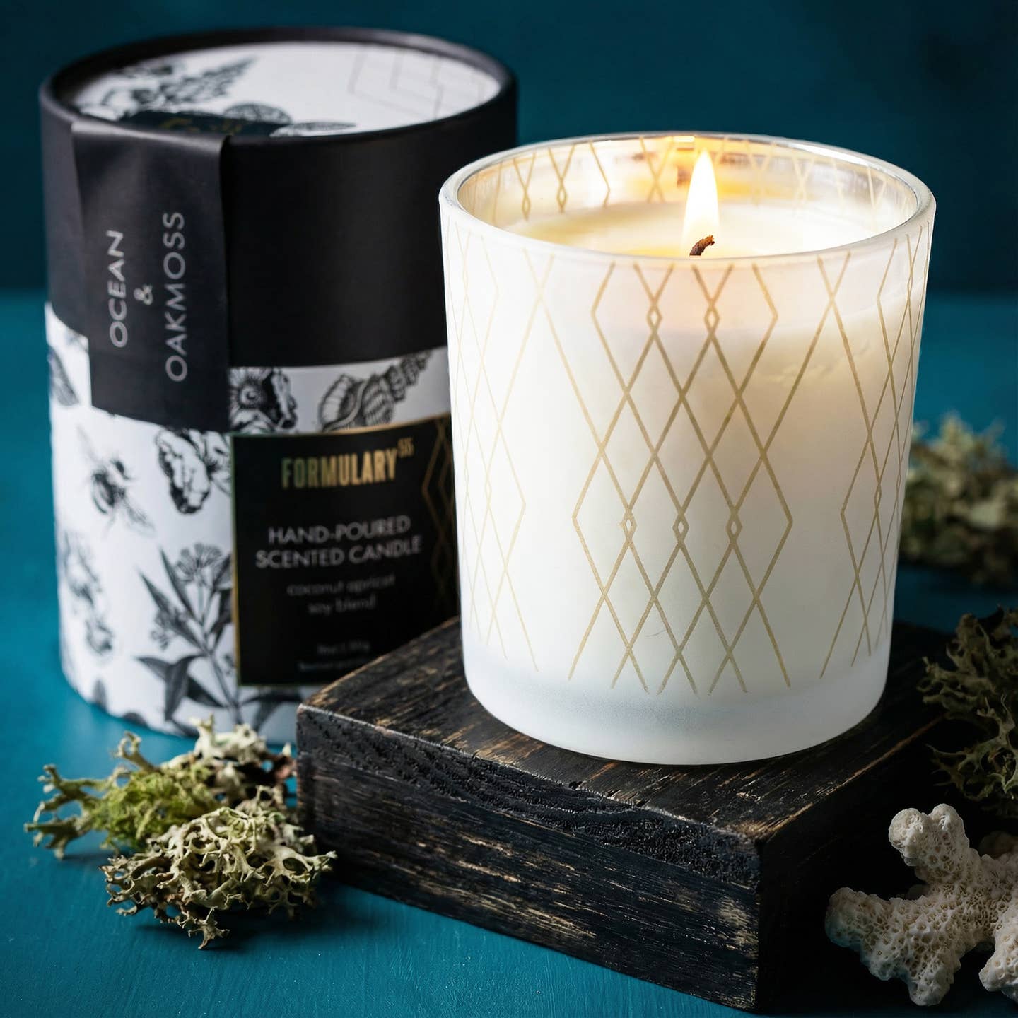 Apportez une touche d’élégance feutrée et de chaleur enveloppante à votre intérieur avec la Bougie Ocean & Oakmoss. Coulée à la main avec le plus grand soin, elle prend place dans un élégant récipient en verre blanc dépoli, sublimé par le motif signature Formulary 55 en losange, délicatement gravé à l'or fin. À l’allumage, la flamme diffuse une lueur douce et scintillante, transformant instantanément l’atmosphère de la pièce en un cocon apaisant et sophistiqué.
